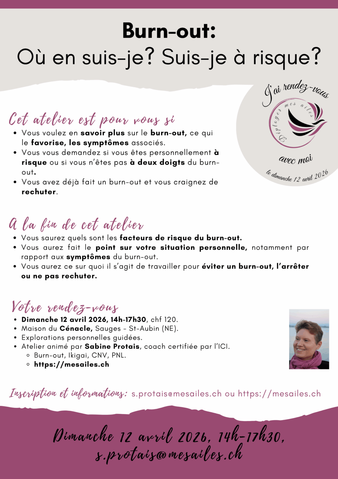 Nos prochains ateliers Prévention Burn-out le 8 mars 2026 En Ligne En ligne S'inscrire Prévention Burn-out 12 avril 2026 Gorgier-St-Aubin S'inscrire Prévention Burn-out Printemps 2026 Gorgier-St-Aubin S'inscrire